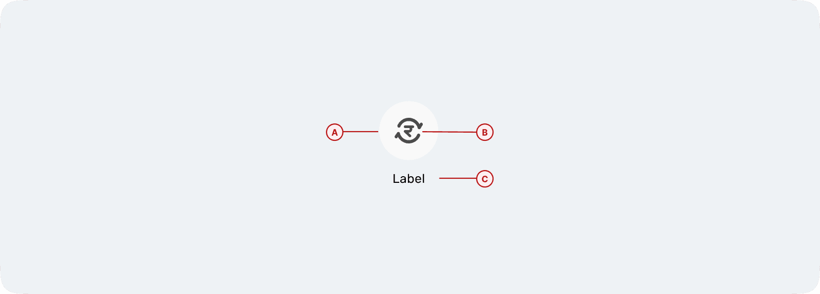 A circular button consists of a styled container (A) with a centered icon (B), and a label below (C) for added clarity.