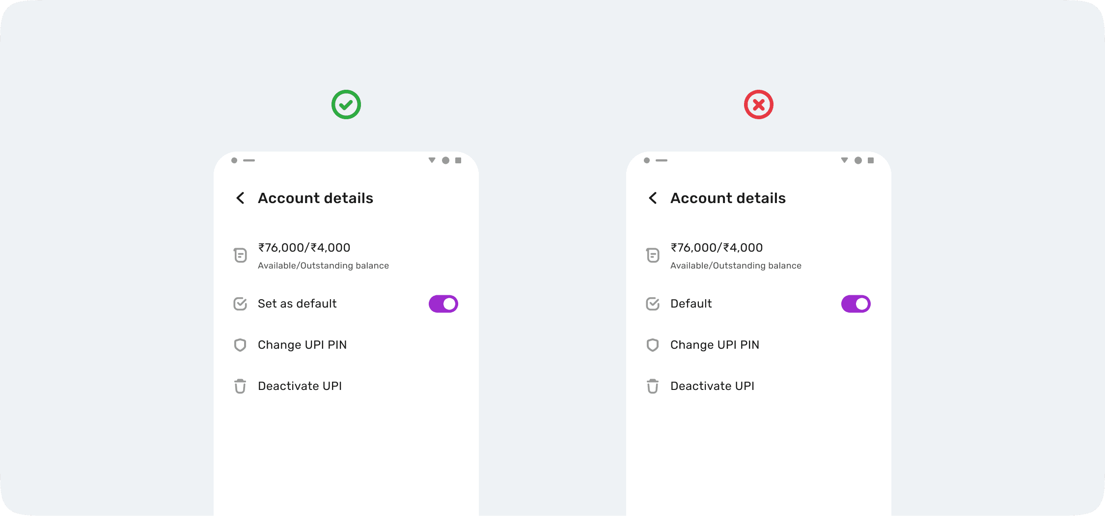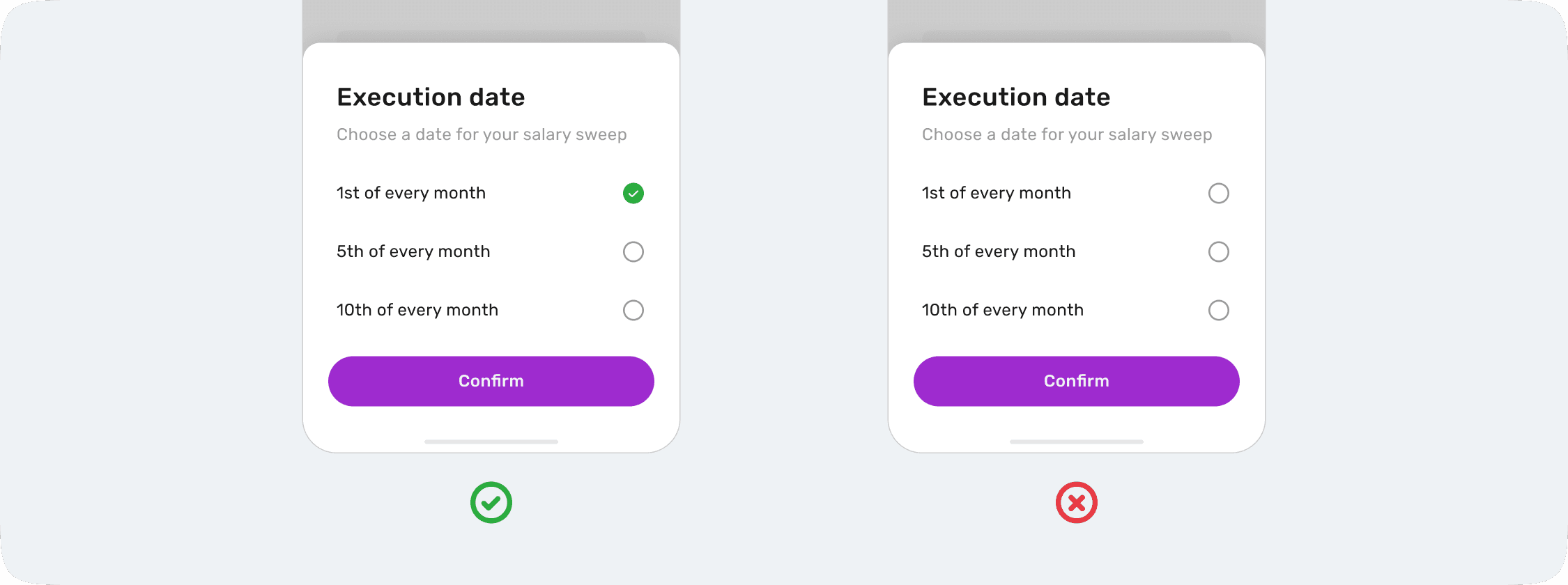 Radio buttons and toggles must have one state selected or active by default.