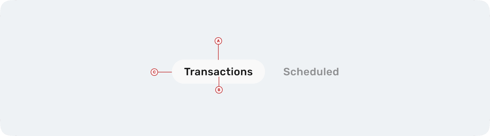 Tabs consist of a container (A), individual tab items (B), and a selection indicator (C) that highlights the active tab.